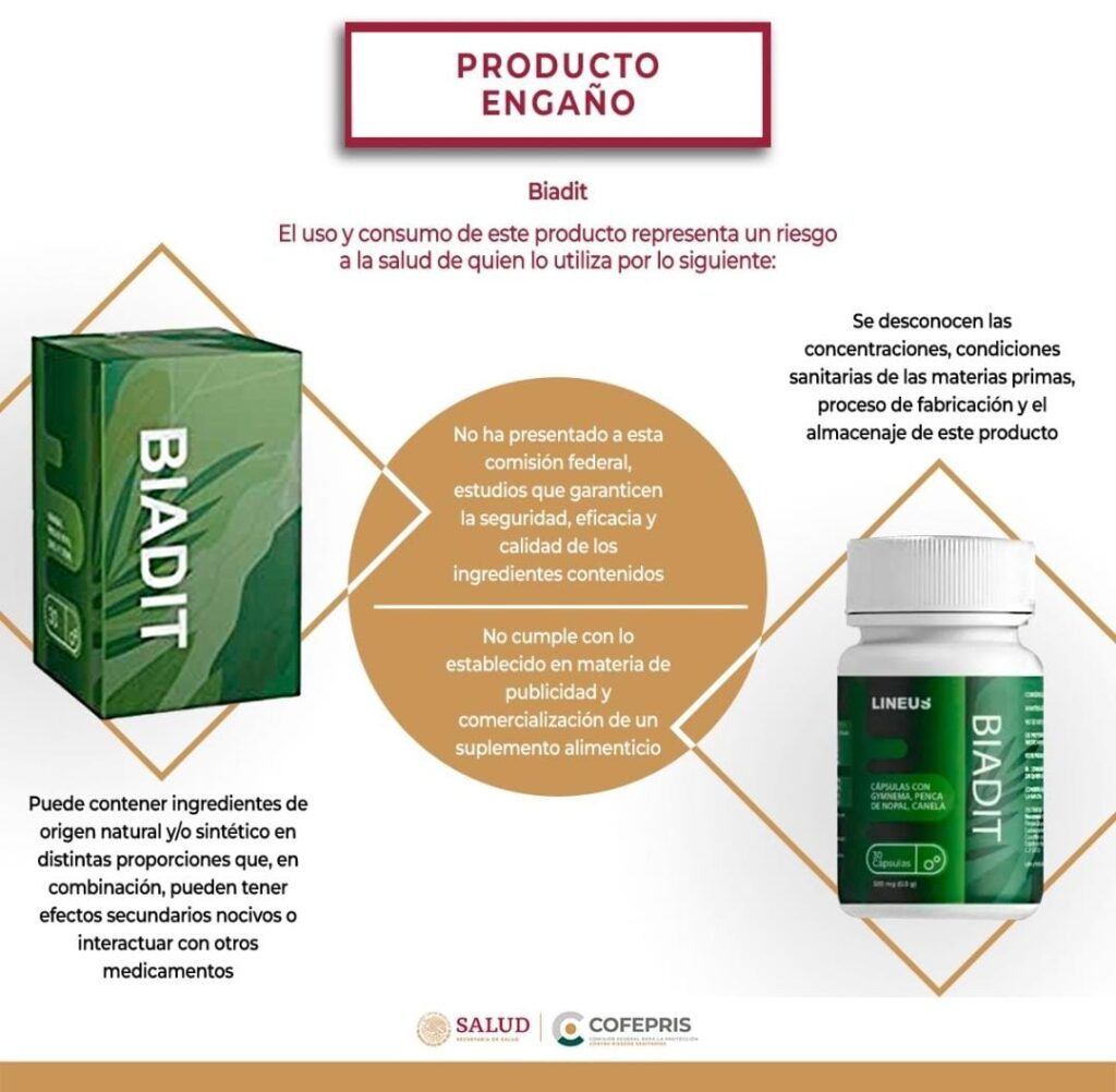 Su nombre es Biadit y contiene ingredientes prohibidos para elaboración de suplementos alimenticios, por lo que la autoridad sanitaria llama a la población a no consumirla, mientras a quienes vendan y publiciten este producto serán sancionados.