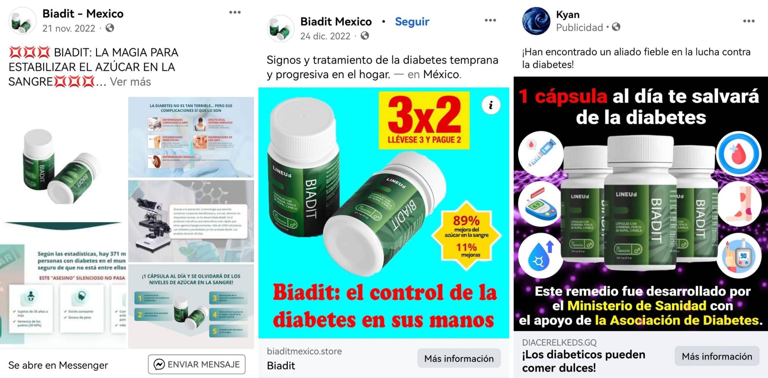 En el mercado nacional y en redes sociales, dicho suplemento engañoso se oferta como medicamento bajo el consumo diario de una cápsula para «salvar de la diabetes» normalizando el azúcar hasta en un 50% y de adquiere por 780 pesos de oferta.