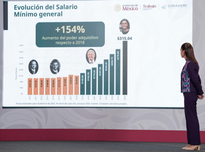 • A partir del 1 de enero de 2026, el salario mínimo aumentará a 315.04 pesos diarios a nivel general y 440.87 pesos en la Zona Libre de la Frontera Norte, beneficiando a 8.5 millones de trabajadores