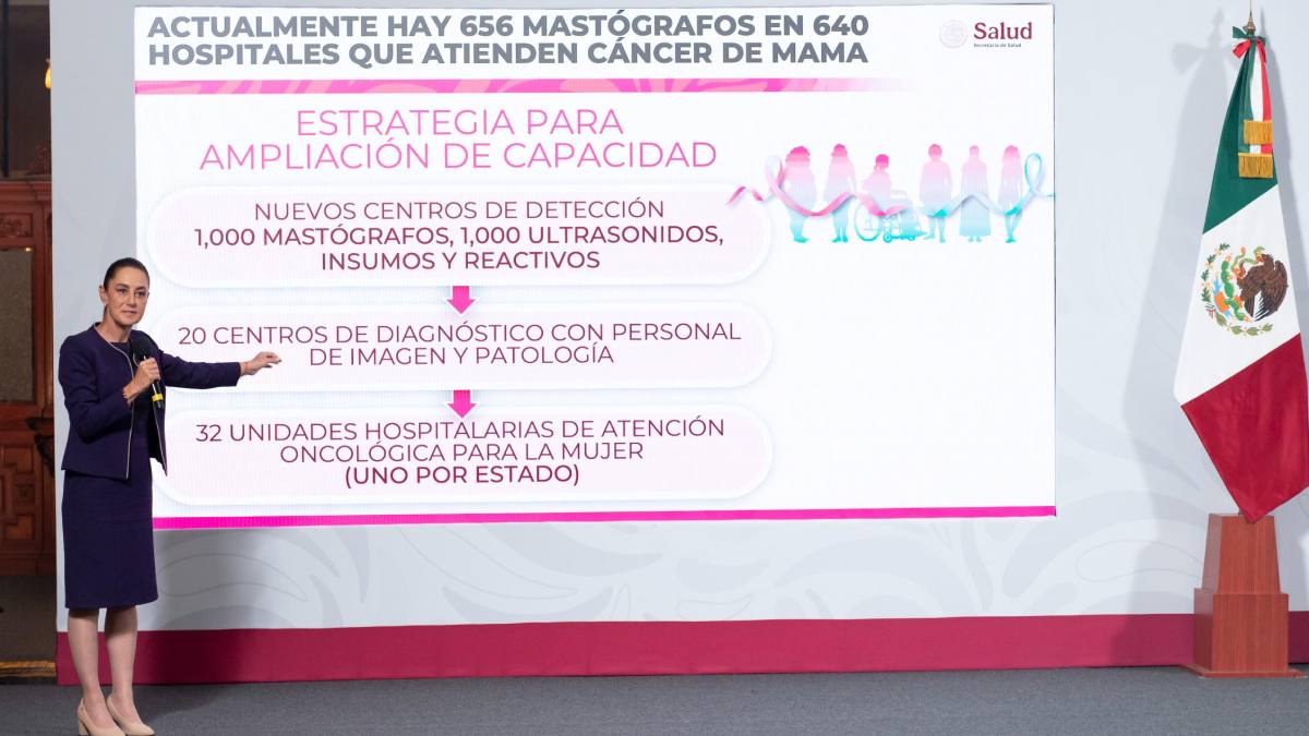 *Ciudad de México, 21 de octubre de 2025.-* La Presidenta Claudia Sheinbaum Pardo anunció una inversión de 8 mil millones de pesos (mdp) que se destinará al Modelo de Atención Universal de Cáncer de Mama, que marcará un antes y un después en la atención de esta enfermedad, que en México es la principal causa de muerte en mujeres, y para ello se adquirirán, entre 2026 y 2027, mil mastógrafos, mil ultrasonidos, —que se sumarán a los 656 mastógrafos que ya están en operación en 640 hospitales—, que estarán en los Nuevos Centros de Detección, además se aperturarán 20 Centros de Diagnóstico con personal de imagen y patología para la interpretación de los estudios y se construirán 32 Unidades Hospitalarias de Atención Oncológica para la mujeres, uno en cada estado.