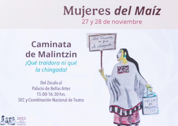 La maestra de Estudios Mesoamericanos por la UNAM, Margarita Cossich Vielman, informó que hoy 28 de noviembre, a las 15:00 horas, se realizará la «Caminata de Malintzin: ¡Qué traidora ni qué la chingada!» de Mujeres del Maíz, partiendo del Zócalo (asta bandera) y finalizando en el Palacio de Bellas Artes.