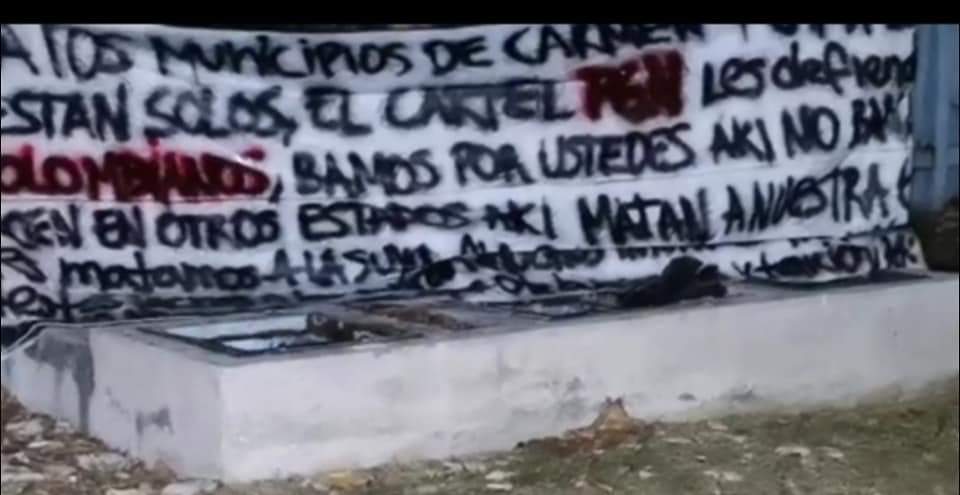 La noche de domingo se tuvo el reporte de que en las inmediaciones de la calle 41 por 44 cerca del edificio Doña Nicha, en la colonia Tecolutla, se encontraba una narcomanta, en ella se apreciaba un mensaje a la Ciudadanía de Carmen y todo el estado de Campeche, el la parte decía “a los municipios de Carmen y Campeche, no están solos el cartel PGN les defiende de colombianos, vamos por ustedes.” esto es parte de lo que decía la narco manta, al lugar llego un fuerte operativo policíaco, esto sucede a escasos días de que ultimaran a una mujer al parecer de origen Colombiano, hecho ocurrido en la Colonia Fátima, aquí en Carmen.