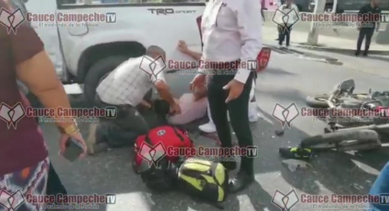 Motociclista se impacta contra camioneta en la zona Ah Kim Pech, siendo llevado de emergencia a un hospital.