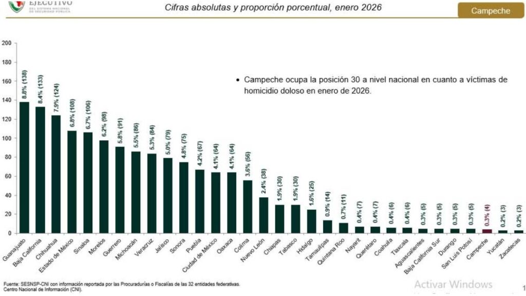 Campeche, con menor incidencia en homicidios dolosos en enero de 2026