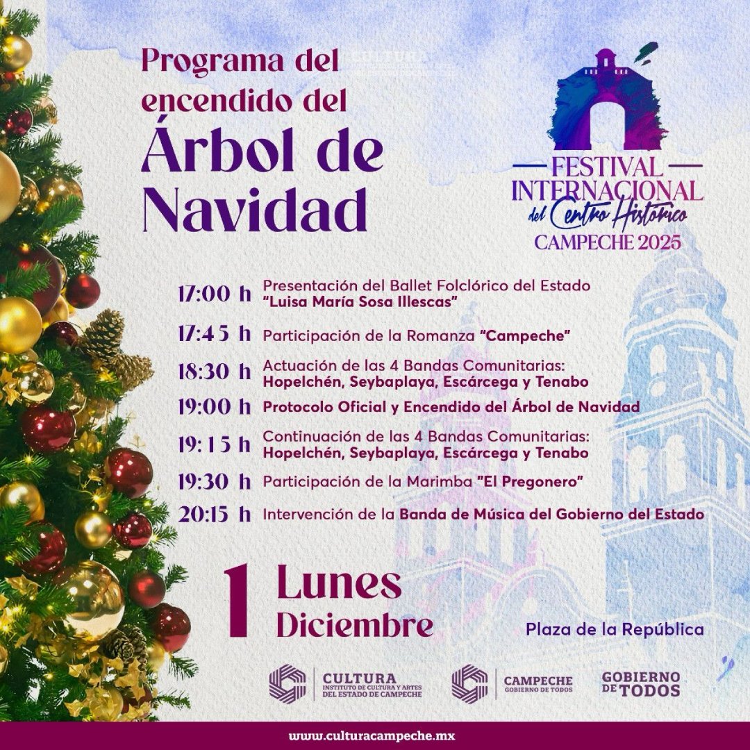 El escenario reunirá al Ballet Folclórico «Luisa María Sosa Illescas”, la Romanza Campeche, las Bandas Comunitarias, la Marimba “El Pregonero” y la Banda de Música del Gobierno del Estado, en una celebración que unirá a familias campechanas en torno a sus raíces culturales y el espíritu navideño.