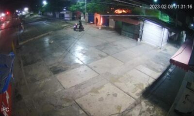 Este es el momento en que sujetos llegan a bordo de una motocicleta para intentar incendiar un local de la zona frontal del Mercado Principal, Pedro...