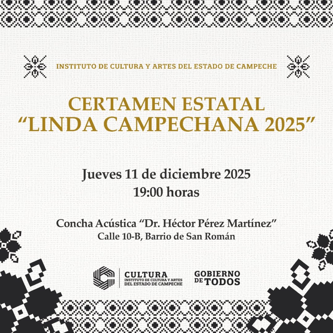 El Instituto de Cultura y Artes del Estado de Campeche realizará el Certamen Estatal «Linda Campechana 2025» el próximo jueves 11 de diciembre a las 19:00 horas en la Concha Acústica «Dr. Héctor Pérez Martínez», ubicada en Calle 10-B, Barrio de San Román.