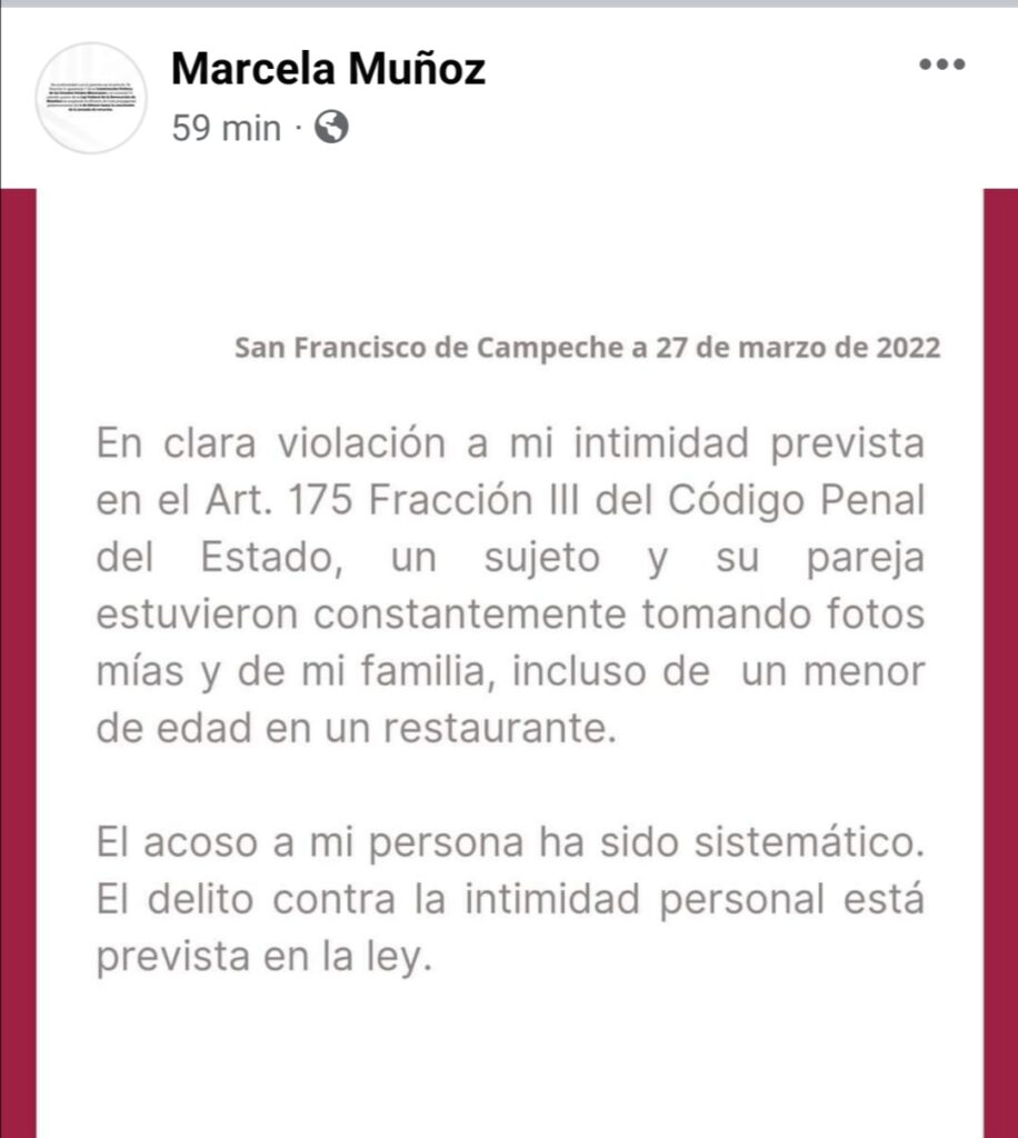 Locales Denuncia Marcela Muñoz violación a su intimidad Published 4 años atrás on 27 de marzo de 2022 By Editor CauceCampeche A través de su cuenta oficial en Facebook la secretaria de Seguridad y Protección Ciudadana dio a conocer que fue víctima de violación a su intimidad, acoso a su persona de forma sistemática. Temas relacionados:Redes Sociales siguiente Rinde protesta Comité de la Juventud que Transforma en Campeche anterior Se fue una heroína, le dan último adiós a Nalah Continue Reading Publicidad Te podría gustar LLEGADA DE 98.2 MILLONES DE VISITANTES INTERNACIONALES A MÉXICO EN 2025 ES RESULTADO DE LA GRANDEZA CULTURAL Y LA TRANSFORMACIÓN DEL PAÍS: PRESIDENTA CLAUDIA SHEIBAUM Efemérides – celebraciones, santoral #MañaneraDelPueblo Presiona para comentar Leave a Reply Cancelar la respuestaTu dirección de correo electrónico no será publicada. Los campos obligatorios están marcados con *Comentario * Nombre * Correo electrónico * Web Guarda mi nombre, correo electrónico y web en este navegador para la próxima vez que comente. Publicidad Más reciente Lo más visto Videos Nacional14 horas atrás LLEGADA DE 98.2 MILLONES DE VISITANTES INTERNACIONALES A MÉXICO EN 2025 ES RESULTADO DE LA GRANDEZA CULTURAL Y LA TRANSFORMACIÓN DEL PAÍS: PRESIDENTA CLAUDIA SHEIBAUM Cultura e Historia18 horas atrás Efemérides – celebraciones, santoral En Vivo19 horas atrás #MañaneraDelPueblo Cultura e Historia1 día atrás Distribuirán en Campeche 3 mil libros gratuitos de la colección «25 para el 25» Locales1 día atrás Recuperan vehículos en filtros de seguridad en Campeche Locales1 día atrás Miércoles de Territorio en la colonia Esperanza Locales1 día atrás Agilizarán trámites y servicios pesqueros como parte del Plan Campeche Locales1 día atrás Piden vecinos de la colonia Esperanza eliminar trasbordo del Ko’ox Locales1 día atrás Incineración de las banderas en Décimo Batallón; abanderan a jardines de niños En Vivo1 día atrás Cauce Campeche Noticias | 25-02-2026 Cultura e Historia18 horas atrás Efemérides – celebraciones, santoral En Vivo19 horas atrás #MañaneraDelPueblo Columnas Escritas5 días atrás Baluarte Político Locales1 día atrás Piden vecinos de la colonia Esperanza eliminar trasbordo del Ko’ox Nacional2 días atrás Infonavit entrega en Oaxaca las primeras Viviendas del Bienestar de ese estado Análisis TV2 días atrás Chismes de Café | 25-02-2026 En Vivo1 día atrás Cauce Campeche Noticias | 25-02-2026 Int. del Edo. Municipal6 días atrás Comienzan a registrarse incendios antes de temporada en el Camino Real Locales2 días atrás Aprueba Congreso Reformas a la Ley de Salud para el Estado de Campeche Locales6 días atrás Gira de trabajo del INDAJUCAM en Nohakal, localidad de Campeche En Vivo19 horas atrás #MañaneraDelPueblo En Vivo1 día atrás Cauce Campeche Noticias | 25-02-2026 Análisis TV2 días atrás Chismes de Café | 25-02-2026 Análisis TV2 días atrás En la Ruta del Jaguar | 25-02-2026 En Vivo2 días atrás Cauce Campeche Noticias | 24-02-2026 En Vivo2 días atrás Martes del Jaguar | T5 capítulo 21 | 24-02-2026 En Vivo3 días atrás Cauce Campeche Noticias | 23-02-2026 Análisis TV4 días atrás Chismes de Café | 23-02-2026 En Vivo6 días atrás Cauce Campeche Noticias | 20-02-2026 Análisis TV7 días atrás Chismes de Café | 20-02-2026 Lo más Visto Cultura e Historia18 horas atrás Efemérides – celebraciones, santoral En Vivo19 horas atrás #MañaneraDelPueblo Columnas Escritas5 días atrás Baluarte Político Locales1 día atrás Piden vecinos de la colonia Esperanza eliminar trasbordo del Ko’ox