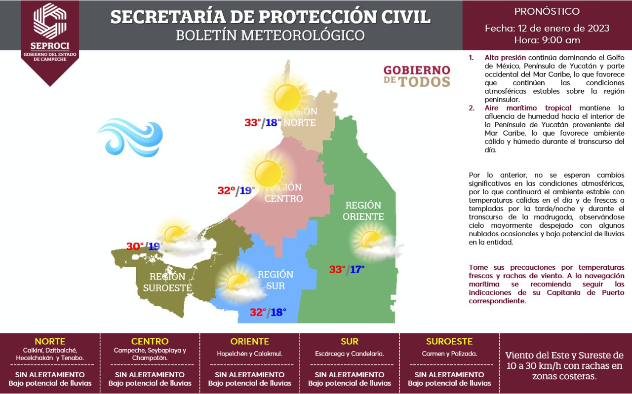 La Secretaría de Protección Civil informa a la población que una nueva Masa de Aire Frío y Frente Frío asociado afectarán a Campeche.