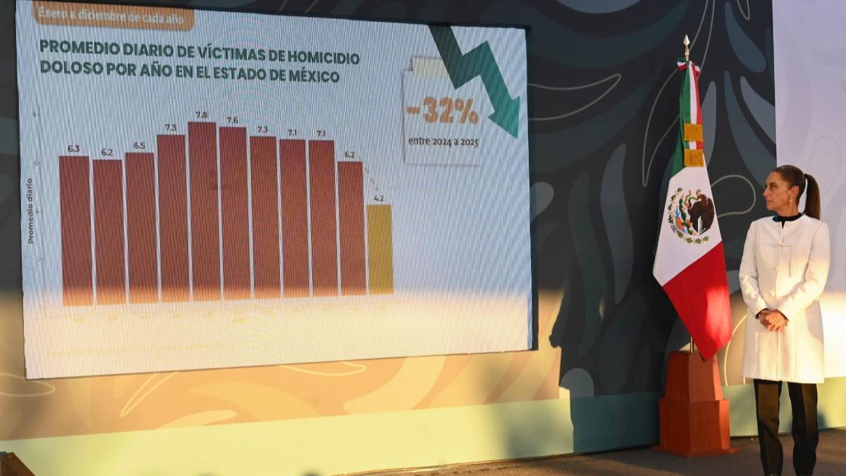 Ecatepec, Estado de México, 16 de enero de 2026.- La Presidenta de México, Claudia Sheinbaum Pardo, resaltó la disminución de 54 por ciento en homicidio doloso en el Estado de México, entre septiembre de 2024 y diciembre de 2025, al pasar de 6.63 a 3.06 el promedio diario de víctimas de este delito; siendo diciembre de 2025 el mes más bajo en este periodo.