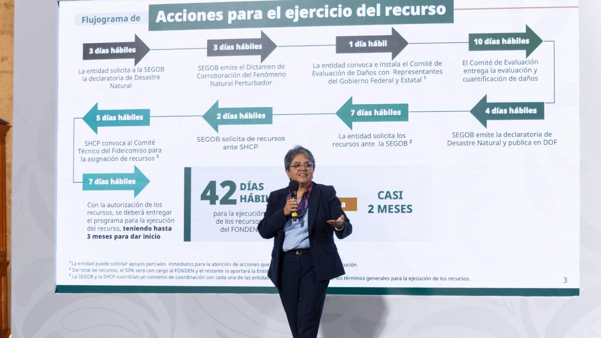 Raquel Buenrostro Sánchez, secretaria de Anticorrupción y Buen Gobierno, explicó que el FONDEN surgió cuando los fideicomisos públicos manejaban los recursos con opacidad y los gobiernos estatales debían aportar el 50% para que la federación cubriera el otro 50%.