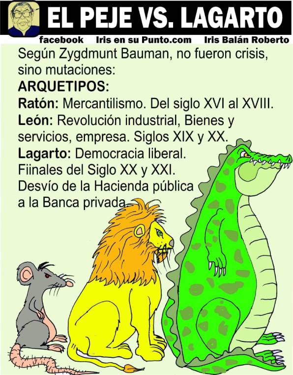 3) El león se transforma en lagarto. El arquetipo del lagarto, representa a la “Democracia liberal”, con sus estrategias de mercado-especulación. Influye en el sector financiero y la banca privada, con su sistema “postdemocrático”, con desvíos de la hacienda pública a la banca privada.