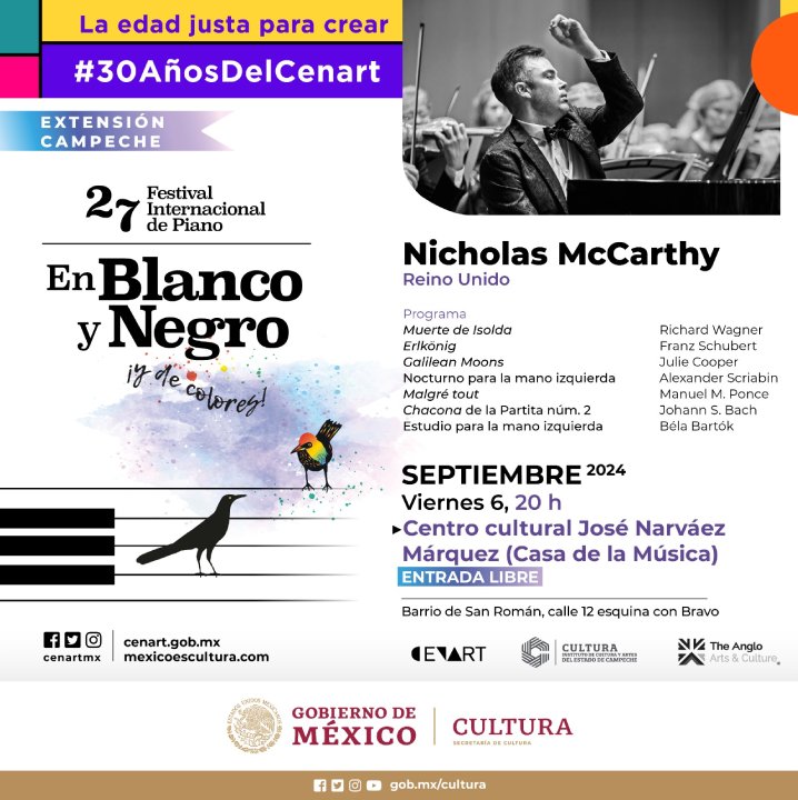 El evento es parte del prestigioso Festival Internacional de Piano en Blanco y Negro… ¡y de colores! que el CENART a través de gestiones realizadas por el Instituto de Cultura estatal ha extendido hacia Campeche, donde el público podrá acceder gratuitamente para deleitarse con la interpretación de Nicholas McCarthy.