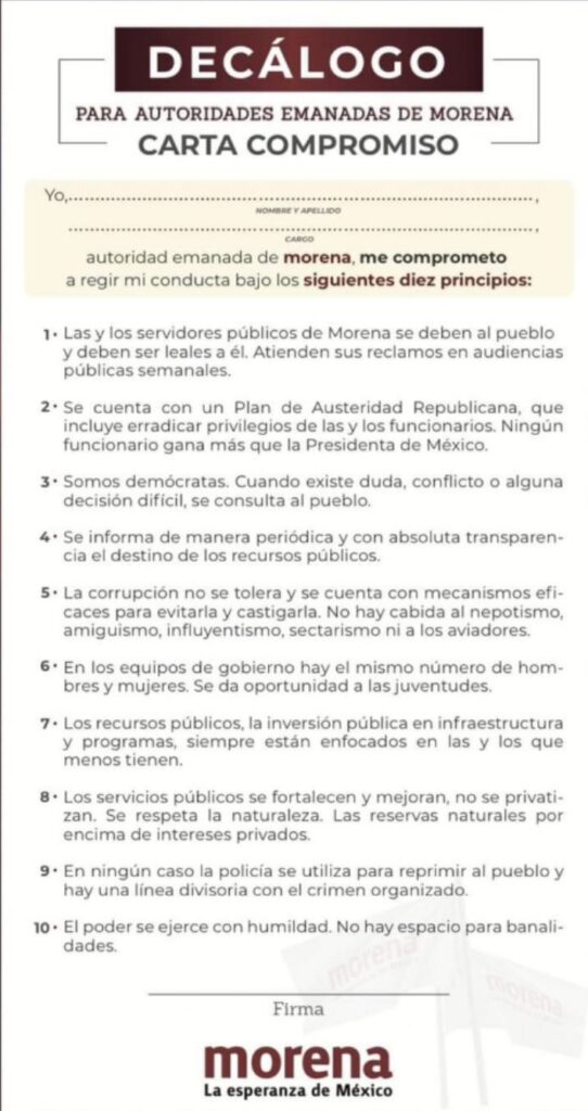 Pues la carta compromiso inicia así, diciendo que las autoridades de morena se deben al pueblo y deben ser leales a él.
