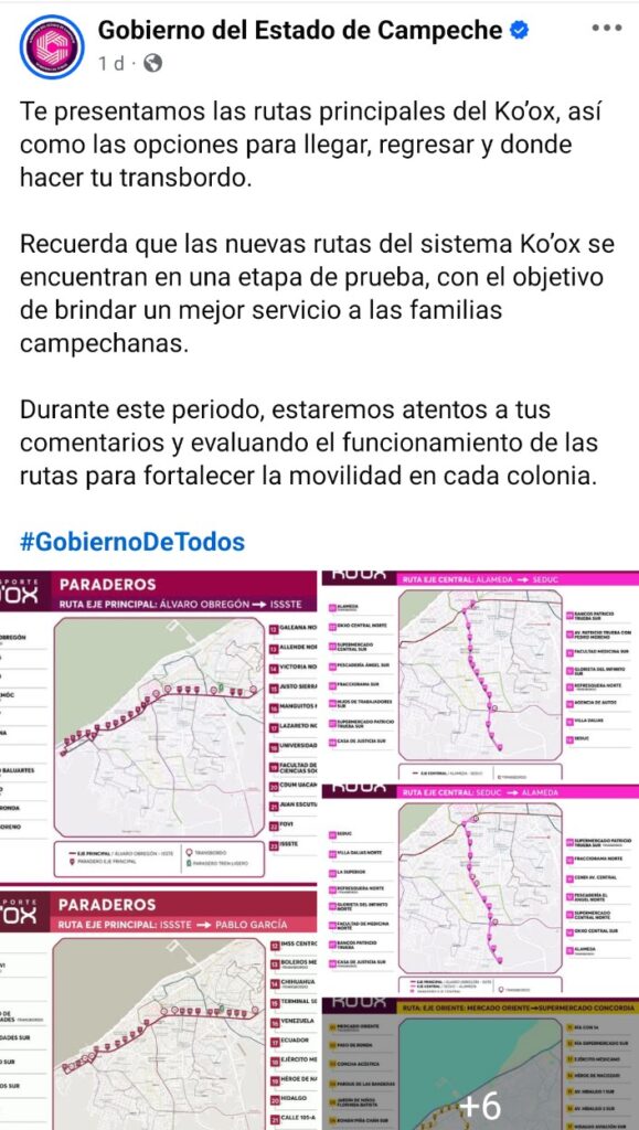 Recuerda que las nuevas rutas del sistema Ko’ox se encuentran en una etapa de prueba, con el objetivo de brindar un mejor servicio a las familias campechanas.