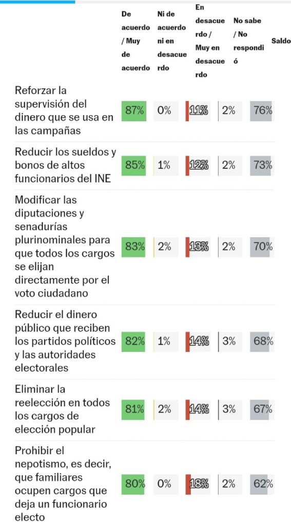 El 87 por ciento aprueba reforzar la supervisión del dinero en campañas, el 85 por ciento aprueba reducir sueldos y bonos de altos funcionarios electorales, el 83 por ciento aprueba elegir todos los cargos legislativos por voto directo y 82 por ciento aprueba recortar el financiamiento público a partidos.