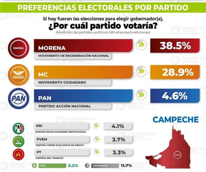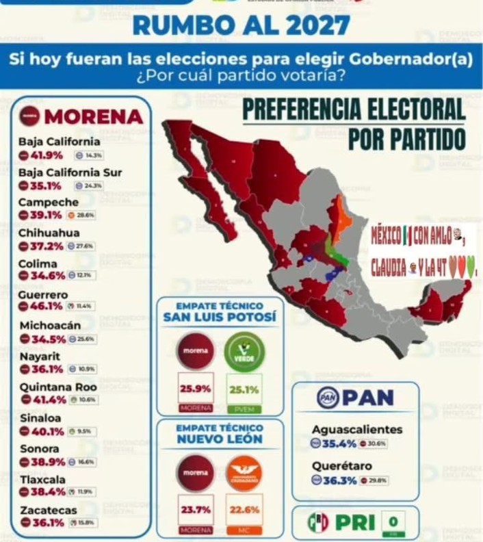 La Jornada publicó los resultados de la encuestadora Demoscopia Digital que, a marzo de 2026, marcan el triunfo de morena en 13 estados para las elecciones del año próximo (incluido Campeche), empate técnico en dos con ligera ventaja de morena (San Luis Potosí y Nuevo León), y ventaja del PAN en dos (Querétato y Aguascalientes), el PRI cero.