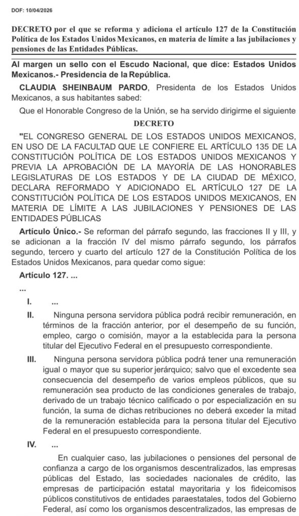 Ayer entró en vigor la reforma constitucional al artículo 127 que pone fin a las «pensiones doradas» de exservidores públicos.