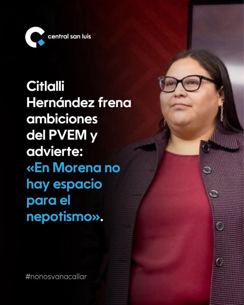 En San Luis Potosí si el Partido Verde decide que su candidata a la gubernatura sea la esposa del actual gobernador (Ricardo Gallardo Cardona), Morena no los acompañaría porque esas no son nuestras reglas ni principios, pero no violentaríamos a nuestros aliados. La alianza con ese partido es principalmente electoral y legislativa. Sin ellos no habríamos podido tener la mayoría en el Congreso para aprobar la reforma judicial: Citlalli Hernández Mora.