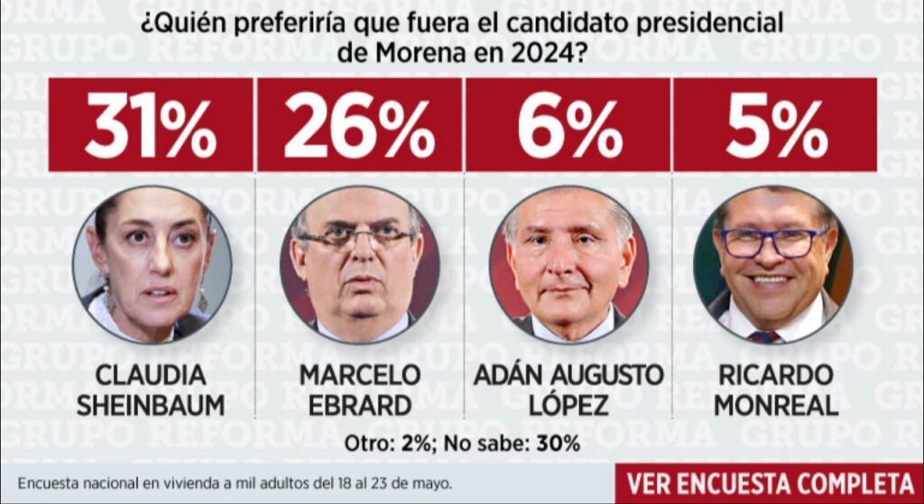 Encuesta tras encuesta (las últimas que vimos esta semana son de Reforma y El Universal) la t0davía jefa de Gobierno de la Ciudad de México, Claudia Sheinbaum, sigue arriba, bastante arriba, con claridad, frente a Marcelo Ebrard y lejos, muy lejos continúan Adán Augusto López (con Alito y todo) y Monri que ya no repuntó nada.