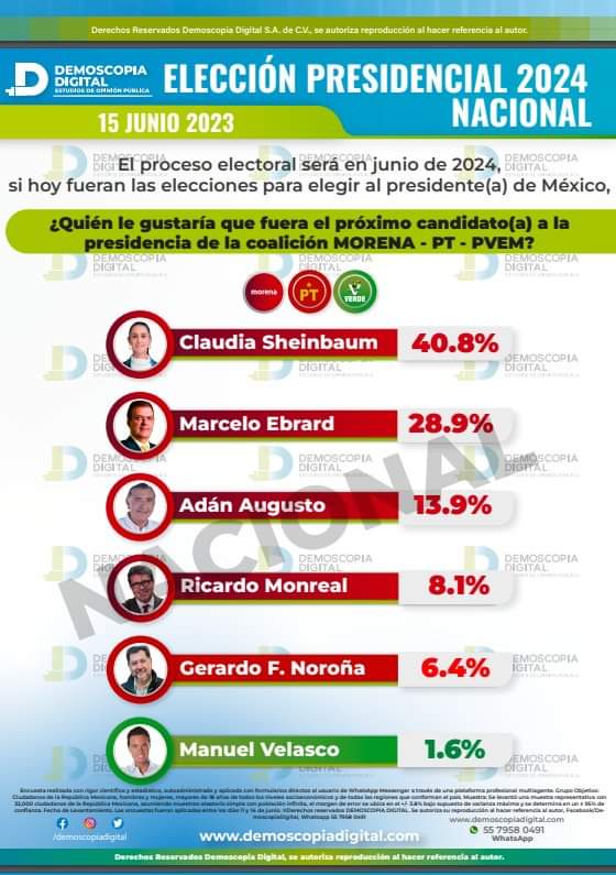 Por cierto, mientras la oposición publica un catálogo de 10 puntos, que anunciará mañana para elegir (en septiembre) al que nombrarán «responsable de la organización del Frente Amplio Va por México» (cualquier parecido con el proceso de morena es pura copia jijiji), los morenistas avanzan y avanzan. Claudia Sheinbaum mantiene cómoda ventaja, según encuestas de estos días.