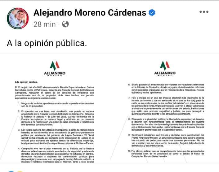 Apenas supo del cateo a “sus vecinos”, del que realizaba la Fiscalía General del Estado de Campeche bajo el mando de Renato Sales, Alito saltó a las redes a lloriquear, a victimizarse, a repetir una y otra vez que se está “judicializando la política”, desde luego, que es un perseguido político y blanco de los desenfrenos de la gobernadora Sansores y del presidente López Obrador.