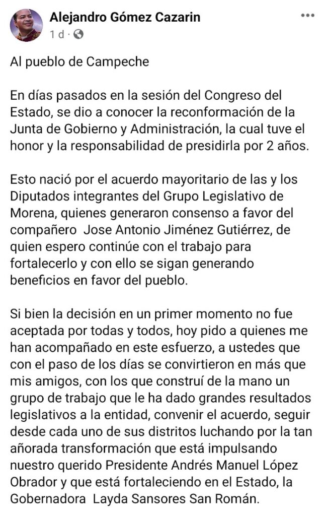 Si bien la decisión en un primer momento no fue aceptada por todas y todos, dijo Cazarín, «hoy pido a quienes me han acompañado en este esfuerzo, a ustedes que con el paso de los días se convirtieron en más que mis amigos, con los que construí de la mano un grupo de trabajo que le ha dado grandes resultados legislativos a la entidad, convenir el acuerdo, seguir desde cada uno de sus distritos luchando por la tan añorada transformación que está impulsando nuestro querido presidente Andrés Manuel López Obrador y que está fortaleciendo en el Estado, la gobernadora Layda Sansores San Román».