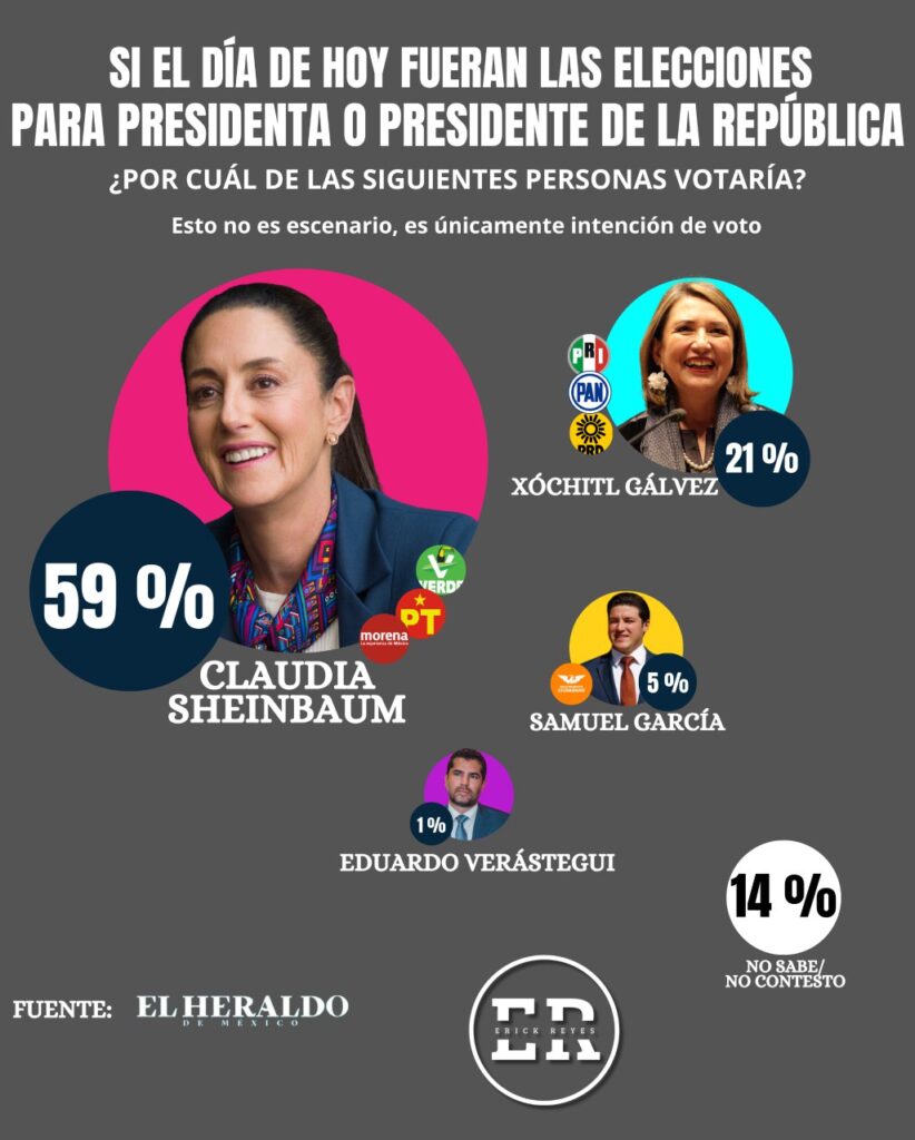 Veamos la más reciente de El Heraldo de México, de esta semana que termina, levantada en los primeros días de noviembre: Claudia: 59 por ciento; Xóchitl: 21 por ciento; Samuel García: 5 por ciento y Eduardo Verástegui: 1 por ciento. La morenista le lleva a la panista la friolera de 38 puntos de ventaja.