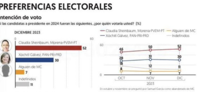Año político, de definiciones históricas, entre ellas la segura elección de la primera mujer presidenta de México, Claudia Sheinbaum, no «Móchilt», que en la medida en que se acerca la elección, estamos a 5 meses, se rezaga. La encuesta de esta semana, de El Financiero, 52 contra 30. Es decir, Claudia le lleva 22 puntos que son varios millones de votos. Y es la más cercana, otras marcan una diferencia de hasta 30 puntos, un mundo pues.