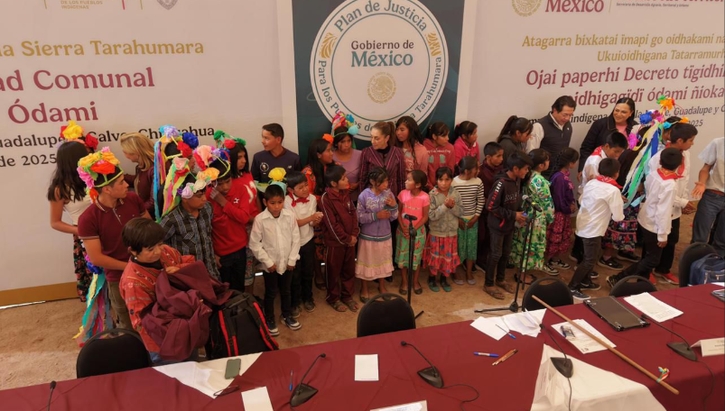 Guadalupe y Calvo, Chihuahua, a 13 de diciembre de 2025.- La Presidenta Claudia Sheinbaum entregó más de 3 mil hectáreas al pueblo Ódami de la Sierra Tarahumara en Chihuahua, despojado de sus tierras, como parte del Plan de Justicia. Con esta acción del Segundo Piso de la Cuarta Transformación, suman 6 mil 26 hectáreas restituidas a pueblos originarios de la Sierra Tarahumara.