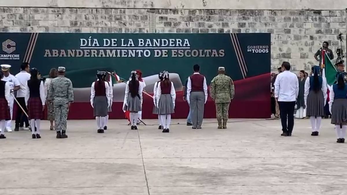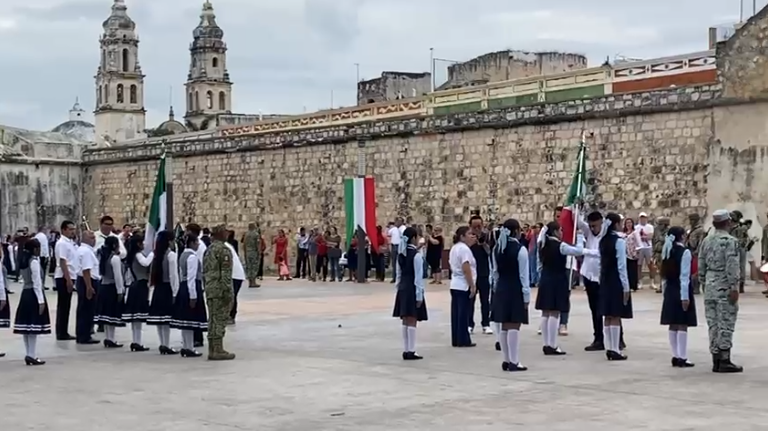 La gobernadora Layda Sansores San Román, encabezó la ceremonia de izamiento de la bandera y abanderamiento de escoltas, acompañada de funcionarios de su gabinete en la Plaza de la República.