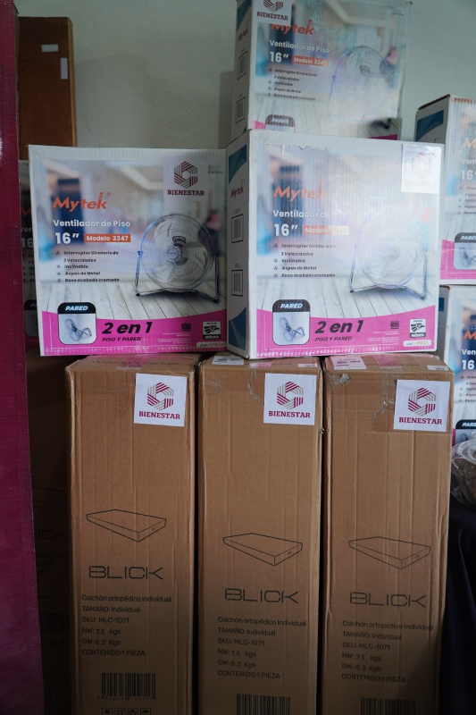 El equipamiento entregado incluyó 1 estante industrial, 10 colchones individuales, 12 ventiladores de piso y pared, 1 paquete de cucharas, 24 platos grandes, 50 vasos de melamina, 2 cucharones de aluminio, 1 olla, 5 arroceras, 1 escurridor de trastes, 1 paquete de 4 botes de basura y 1 estante de baño, con lo cual se fortalece la infraestructura social y se respalda a las organizaciones que trabajan en favor de las familias campechanas.