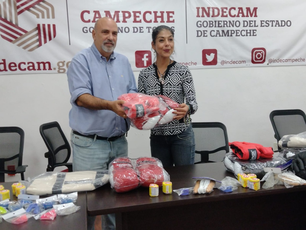 El Gobierno del Estado, a través del director del Instituto de Deportes (INDECAM) Francisco Menéndez Botanez, hizo entrega de material deportivo para la práctica de boxeo para internos del Centro de Reinserción Social, San Francisco, Kobén, a la Directora General de Servicios Postpenitenciarios del mismo centro, en un evento realizado en la sala de juntas del CEDAR.