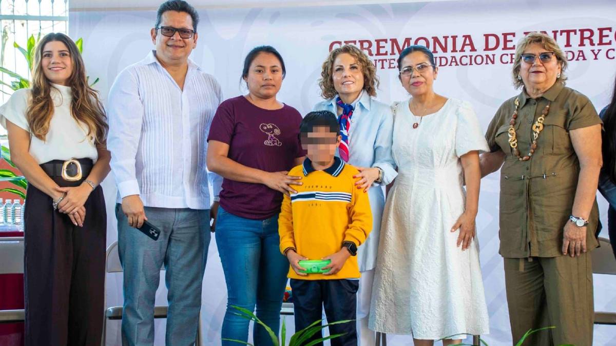 De manera simbólica, se entregaron lentes a Sophia Guadalupe Chi Canul, Elian André Pinzón Cetina, Amari Silvana Cach Pérez, Eliel Alejandro Cahuich Tun, Gabriel Eleazar Contreras Cach y Derek José May Mendieta.