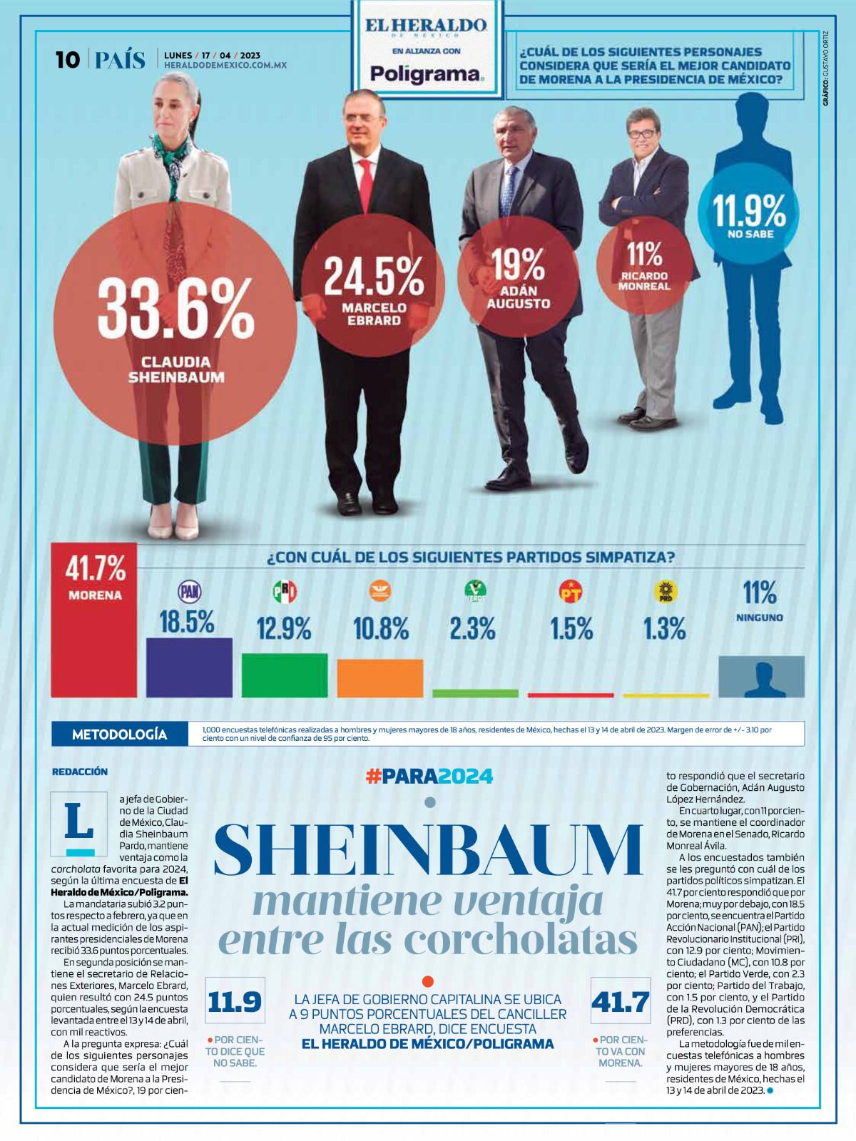 “En segunda posición se mantiene el secretario de Relaciones Exteriores, Marcelo Ebrard, quien resultó con 24.5 puntos porcentuales, según la encuesta levantada entre el 13 y 14 de abril, con mil reactivos”.