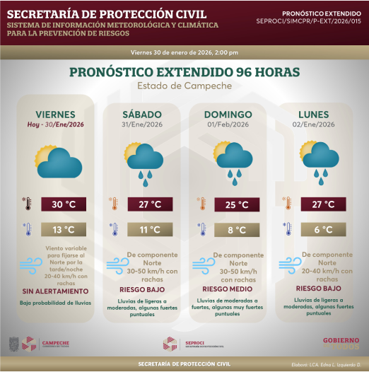 Estos sistemas favorecerán en el Estado de Campeche, a partir de este fin de semana e inicio de la próxima, temperaturas templadas durante el día y frescas a frías durante la noche y madrugada.