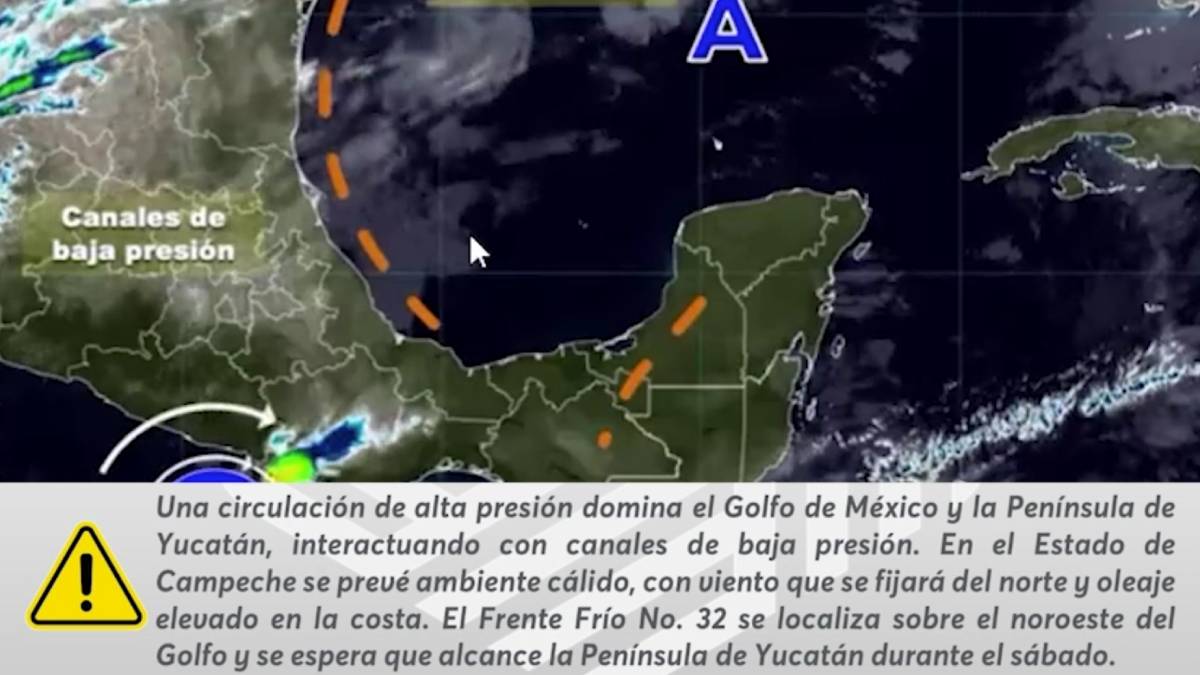 El Frente Frío No. 32 sobre el noroeste del Golfo de México, con dirección al sureste, impulsado por una masa de aire ártico y alta presión asociada, se espera que alcance la Península de Yucatán durante el sábado.