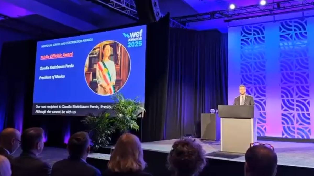 La Water Environment Federation (WEF) galardona a la Presidenta Claudia Sheinbaum con el Premio Public Officials Award, siendo la primera Jefa de Estado en recibir un reconocimiento de este tipo, por su liderazgo e impulso en proyectos hídricos, con los que busca garantizar un acceso universal al agua.
