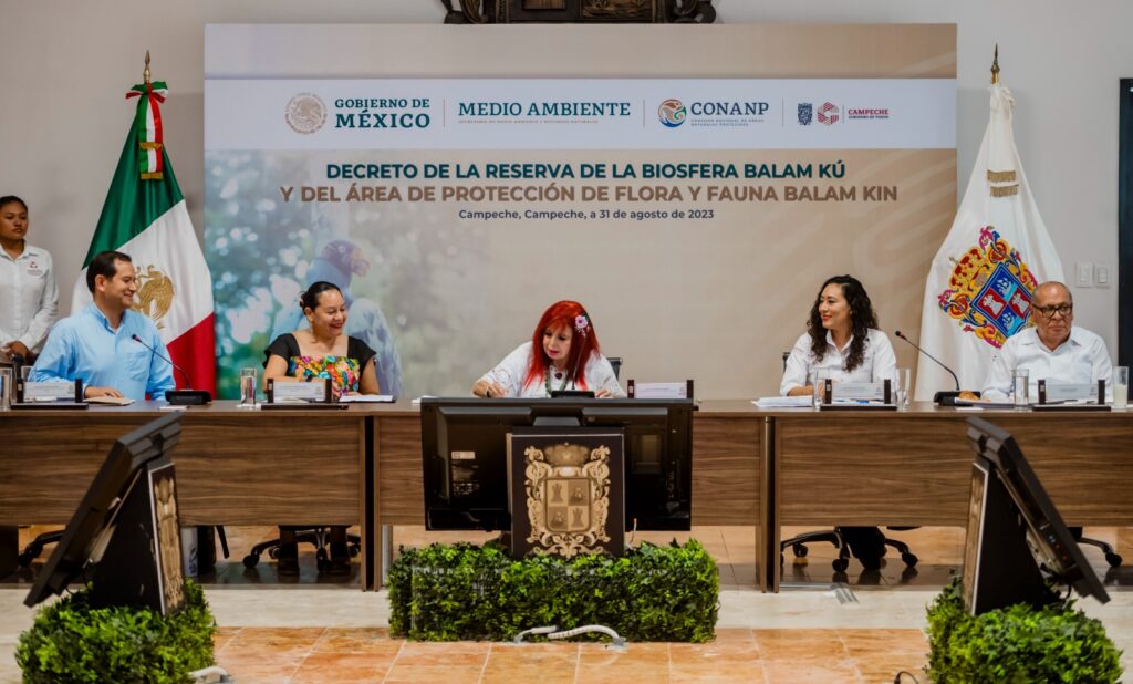La Gobernadora Layda Sansores San Román firmó hoy los decretos de la Reserva de la Biosfera Balam Kú y del Área de Protección de Flora y Fauna Balam Kin, en conjunto con la SEMARNAT, la CONANP y la SEMABICCE, mismos que permiten fortalecer la protección de la región Gran Calakmul, que abarca 1.5 millones de hectáreas de la selva maya del Estado, y que la convierte en una de las reservas naturales de selva tropical más importantes del mundo.