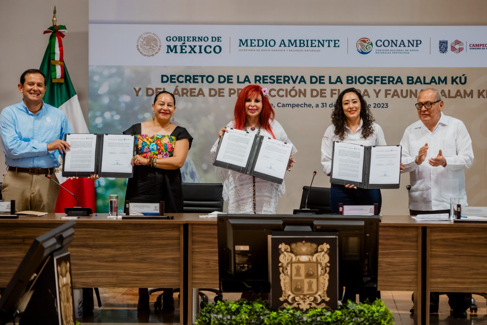 La Gobernadora Layda Sansores San Román firmó hoy los decretos de la Reserva de la Biosfera Balam Kú y del Área de Protección de Flora y Fauna Balam Kin, en conjunto con la SEMARNAT, la CONANP y la SEMABICCE, mismos que permiten fortalecer la protección de la región Gran Calakmul, que abarca 1.5 millones de hectáreas de la selva maya del Estado, y que la convierte en una de las reservas naturales de selva tropical más importantes del mundo.