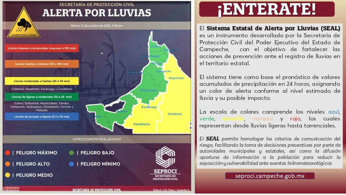 La Secretaría de Protección Civil invita a la población a conocer el Sistema Estatal de Alerta por Lluvias (SEAL), el cual es un instrumento desarrollado por la Secretaría de Protección Civil del Poder Ejecutivo del Estado de Campeche con el objetivo de fortalecer las acciones de prevención ante el registro de lluvias en el territorio estatal.