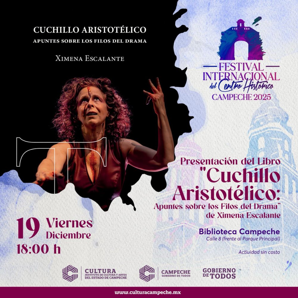 El viernes 19 de diciembre cerrará la semana con tres eventos destacados. A las 18:00 horas en la Biblioteca Campeche se llevará a cabo la presentación del libro «Cuchillo aristotélico». Apuntes sobre los Filos del Drama» de Ximena Escalante.