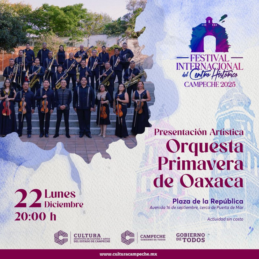 El lunes 22 de diciembre a las 20:00 horas en la Plaza de la República se presentará la Orquesta Primavera de Oaxaca, evento popular que acerca la música sinfónica al público en un ambiente festivo.