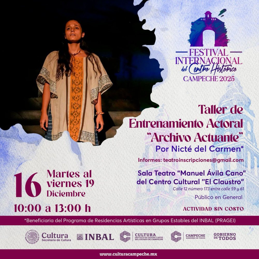 Del martes 16 al viernes 19 de diciembre, de 10:00 a 13:00 horas en la Sala Teatro Manuel Ávila Cano del Centro Cultural «El Claustro», se impartirá el Taller de Entrenamiento Actoral «Archivo Actuante» por Nicté del Carmen.