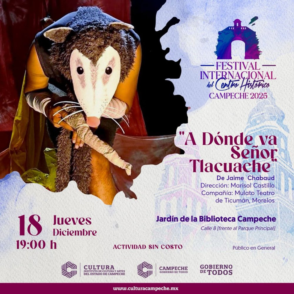 A las 19:00 horas en el jardín de la Biblioteca Campeche, la Compañía Mulato Teatro de Ticumán, Morelos, presentará «A dónde va, señor Tlacuache», de Jaime Chabaud, con dirección de Marisol Castillo, obra teatral inspirada en la tradición popular mexicana.