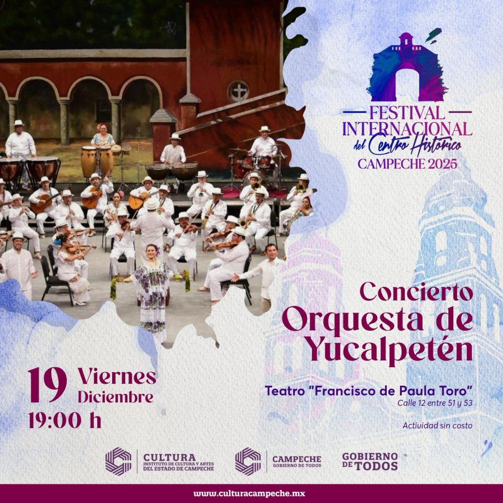 A las 19:00 horas en el Teatro «Francisco de Paula Toro» se presentará el Concierto de la Orquesta de Yucalpetén, que resaltará el patrimonio musical yucateco mediante la interpretación de un repertorio tradicional y popular.
