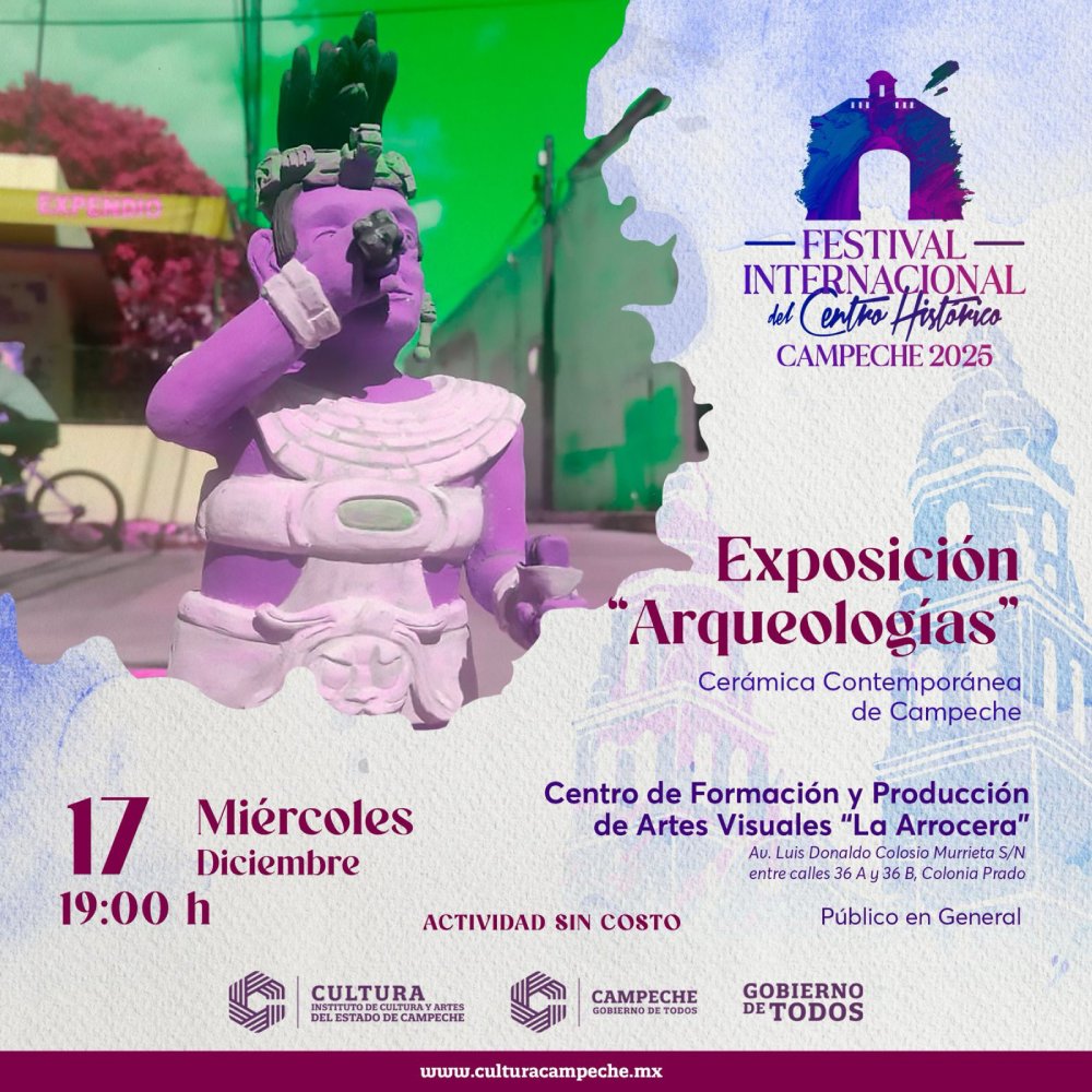 A las 19:00 horas en el Centro de Formación y Producción de Artes Visuales «La Arrocera» se inaugurará la exposición «Arqueologías», Cerámica Contemporánea de Campeche, exposición colectiva que presenta obras cerámicas contemporáneas inspiradas en la identidad maya y las tradiciones regionales.