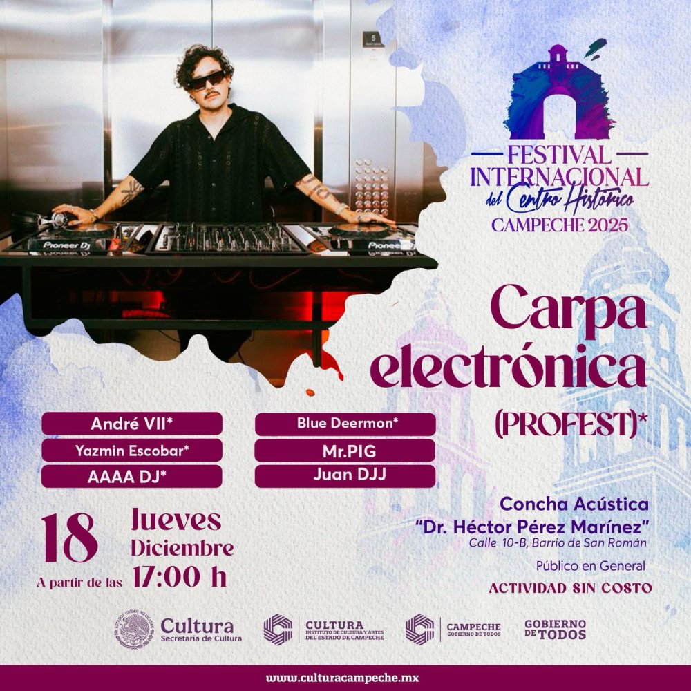 El jueves 18 de diciembre promete ser una jornada ecléctica. A partir de las 17:00 horas en la Concha Acústica Dr. «Héctor Pérez Martínez» se llevará a cabo la Carpa Electrónica con André VII y Yazmin Escobar, AAAA DJ, Blue Deermon, DJ Mr.PIG, Juandjj y DJ sorpresa.