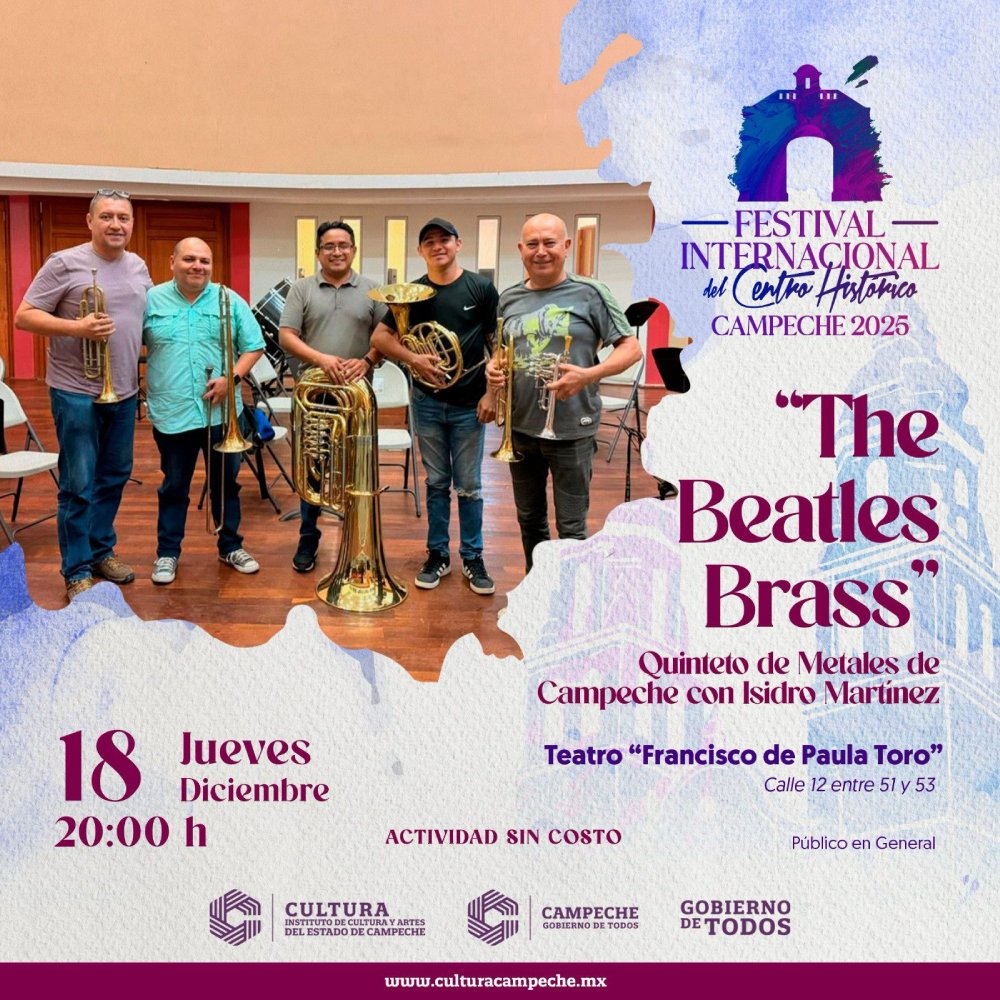A las 20:00 horas, el Teatro «Francisco de Paula Toro» vibrará con «The Beatles Brass», Quinteto de Metales de Campeche con Isidro Martínez, fusionando la sonoridad del quinteto de metales con los clásicos de The Beatles.