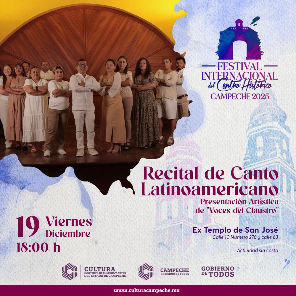 A las 18:00 horas en el Ex Templo de San José se realizará el Recital de Canto Latinoamericano con la participación del Coro «Las Voces del Claustro», celebrando la riqueza del repertorio latinoamericano.